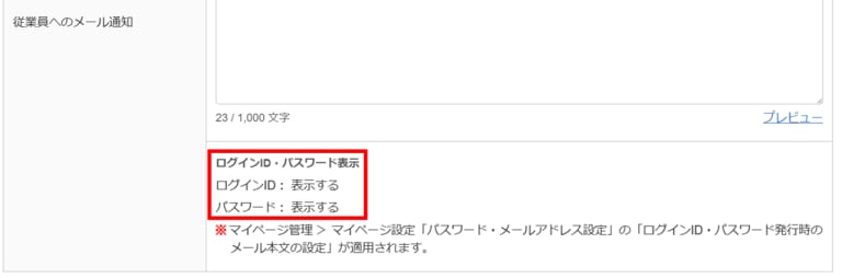 - メール本文内の「ログインID・パスワード表示」を変更する場合は、[マスタ管理]>[マイページ管理]>[マイページ設定]にて、「ログインID・パスワード発行時のメール本文の設定」を変更してください。