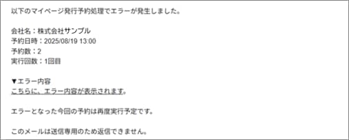 - 予約日時になると、マイページ発行処理を開始します。操作者のメールアドレスが登録されている場合は、処理の開始と終了時に、登録メールアドレス宛にメールが送信されます。