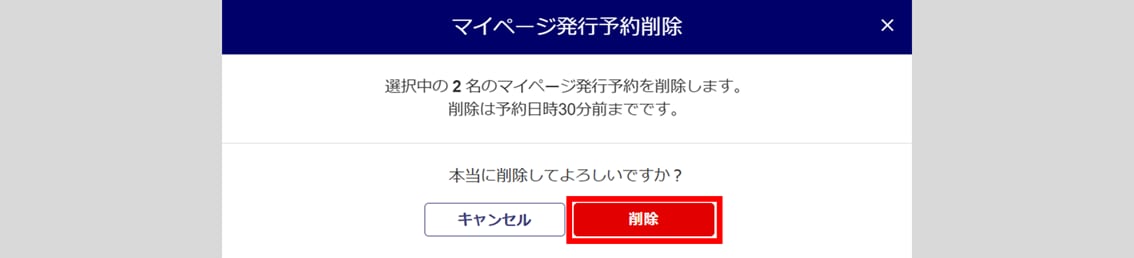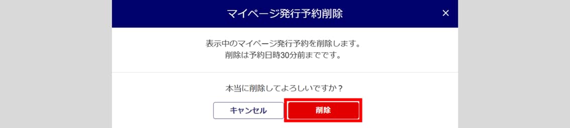 マイページ発行予約の削除は、予約日時の30分前までです。
