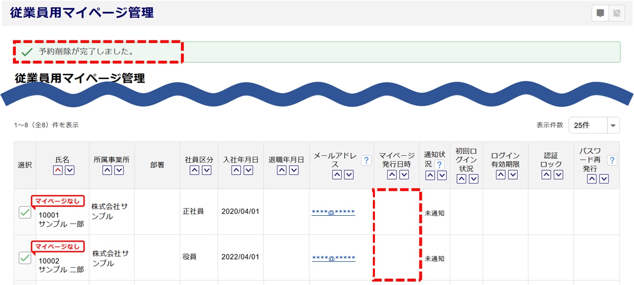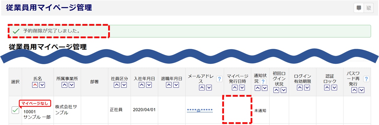 - 画面上部に「予約削除が完了しました。」と表示され、「マイページ発行日時」欄が空白になります。