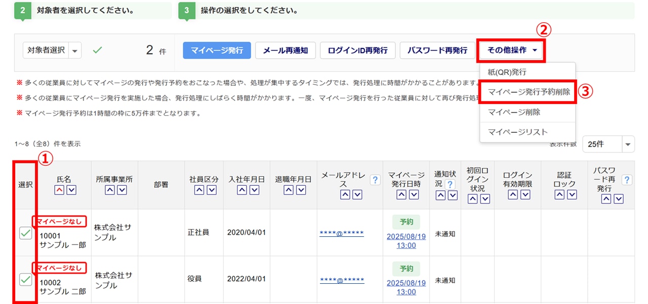 - 予約削除する従業員の「選択」列(①)にチェックを付け、[その他操作](②)>[マイページ発行予約削除](③)をクリックします。