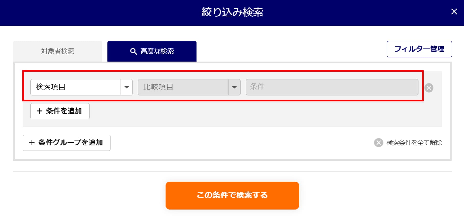 - 「検索項目」「比較項目」「条件」を設定します。「比較項目」「条件」は「検索項目」により表示される選択肢が変わります。