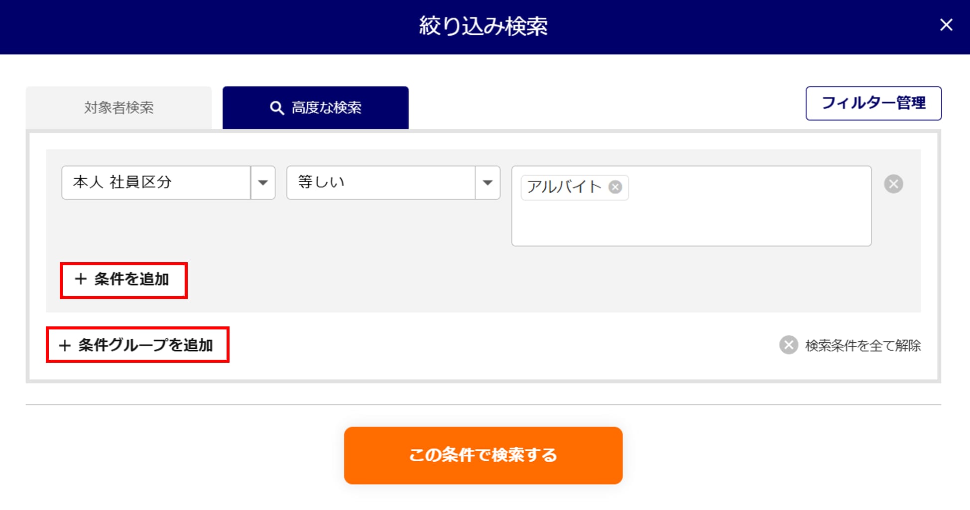 「従業員番号」や「社員区分」などの絞り込みたい情報を設定し、[この条件で検索する]をクリックします。
