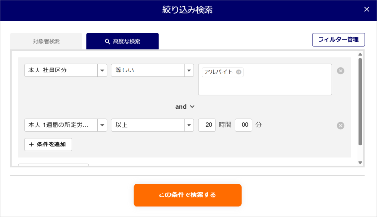 例1:社員区分がアルバイトで週20時間以上の所定労働時間の方を検索する場合