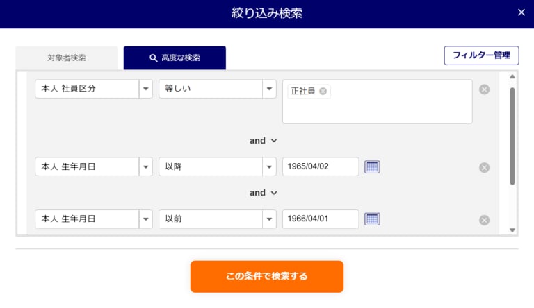例2:正社員で本年度中に60歳を迎える方を検索する場合 - 条件を設定後、[この条件で検索する]をクリックします。「現在の検索条件:フィルター」と表示され、絞り込んだ従業員が表示されます。