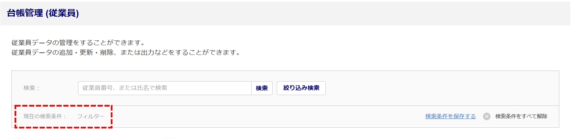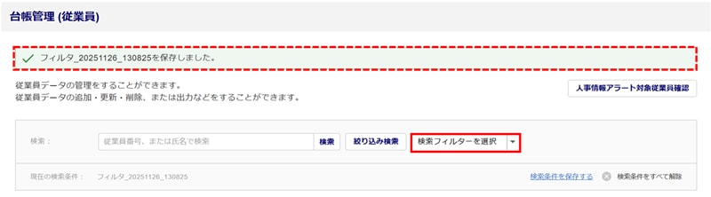 「現在の検索条件」が表示され、絞り込んだ従業員が表示されます。
