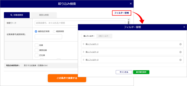 [絞り込み検索]>[フィルター管理]からフィルターの並べ替えや削除、編集ができます。