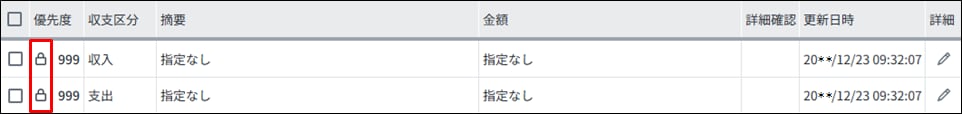仕訳パターンにて科目を変更されていた場合は、改めて仕訳ルールにて科目を設定いただく必要があります。 - 優先度に鍵アイコンが表示されているものは、あらかじめ用意されている仕訳ルールのため編集、削除はできません。