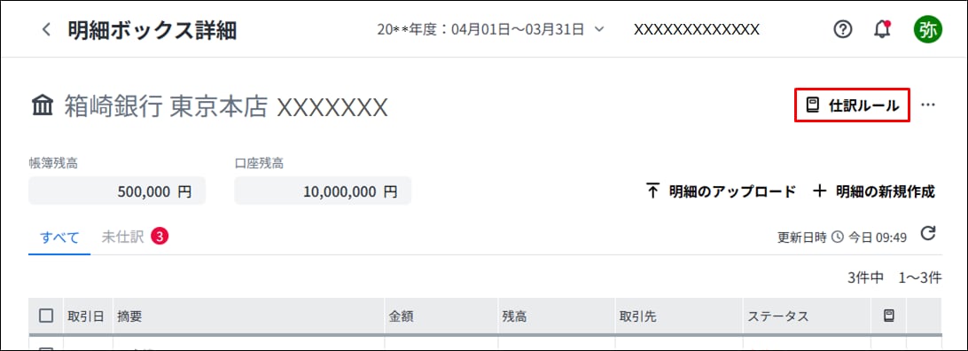 - [明細ボックス]画面、または[明細ボックス詳細]画面の右上にある[仕訳ルール]をクリックします。