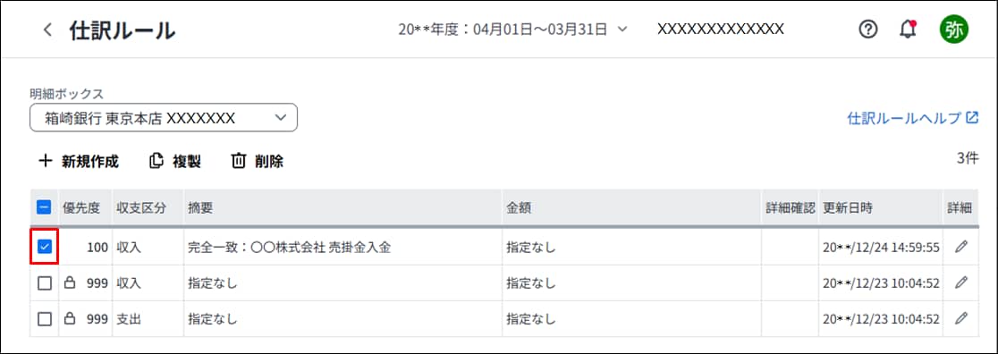 - [仕訳ルール]画面で登録済み仕訳ルールの一覧から、複製したい仕訳ルールを選択します。