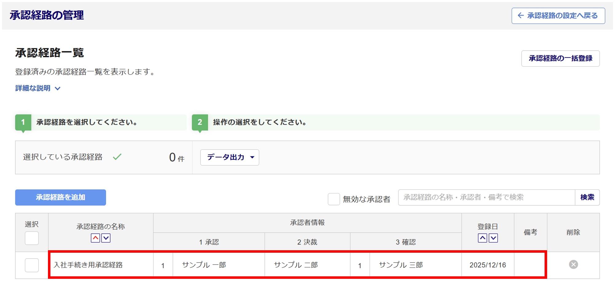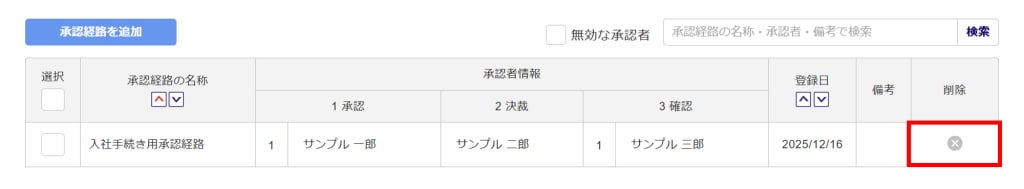 登録済みの承認経路を削除する場合は、対象の承認経路の「削除」列をクリックします。