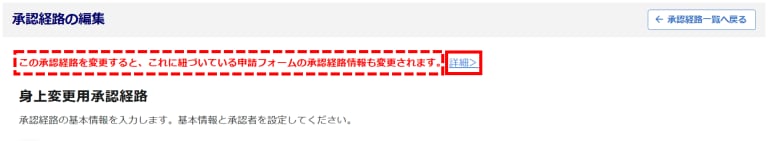「承認経路の管理」登録方法編集する承認経路が、申請フォームに紐付け設定している場合、メッセージが画面上部に表示されます。[詳細>]をクリックすると、紐づけ設定している申請フォームを確認できます。