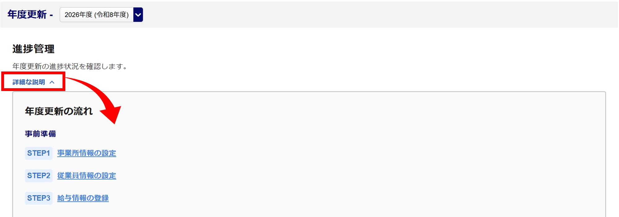 「詳細な説明」をクリックすることで、「年度更新の流れ」を確認することができます。