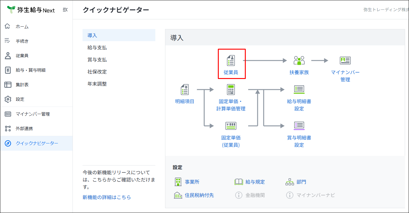 クイックナビゲーターは、これまで弥生給与(やよいの給与計算)で利用していた各種機能が、弥生給与 Nextのどこにあるかをわかりやすく案内しています。
