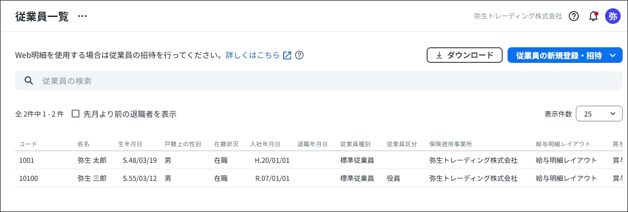 例えば、「従業員」をクリックすると、従業員一覧が表示されます。