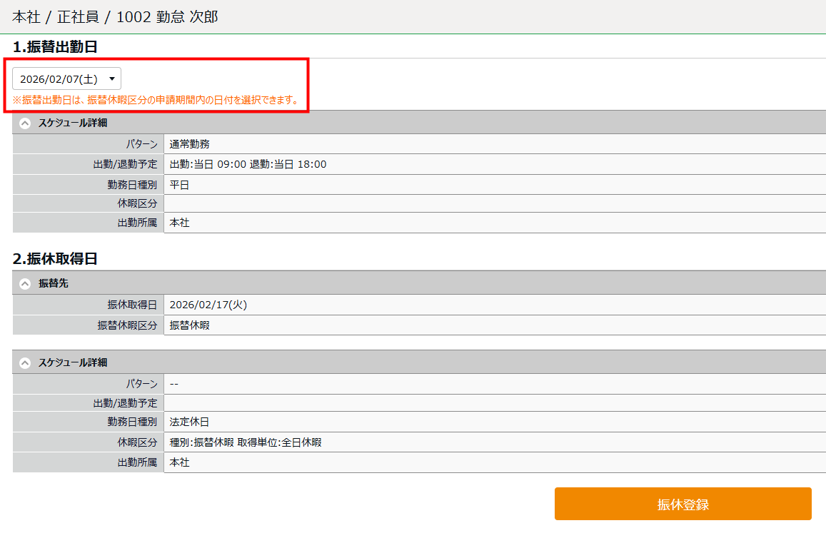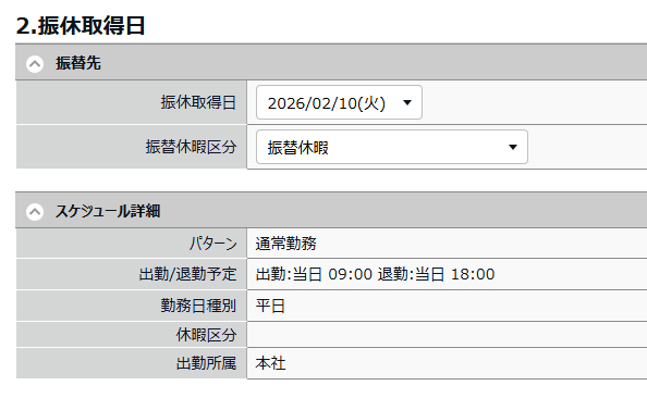 - 「振休取得日」と「振替休暇区分」を選択します。以下に当てはまる日が、「振休取得日」の選択肢として表示されます。
