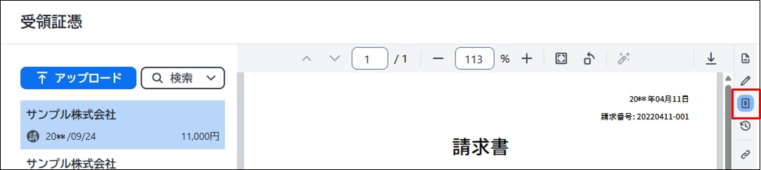 - 情報を設定したい証憑を選択して、画面右側の[支払管理]アイコンをクリックします。
