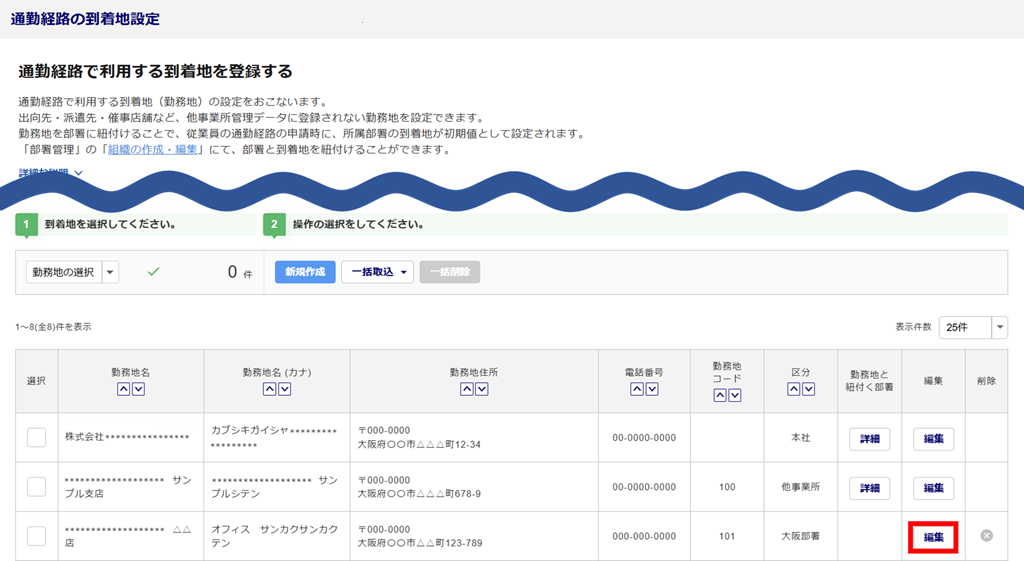 「企業設定」「他事業所管理」にて登録した「勤務地名」「勤務地名(カナ)」「住所」「電話番号」「勤務地コード」の編集については、以下の関連記事をご参照ください。