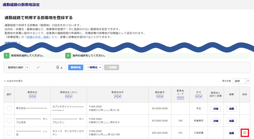 本操作では「企業設定」「他事業所管理」にて登録した到着地の削除はできません。