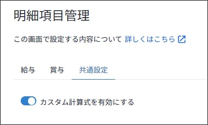 カスタム計算式を設定するには、明細項目管理の共通設定から「カスタム計算式を有効にする」をオンにします。