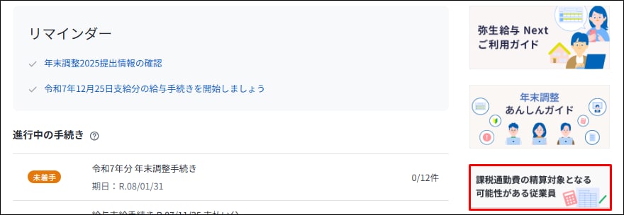 弥生給与 Nextのホーム画面から、[課税通勤費の精算対象となる可能性がある従業員]を開いて操作を行います。