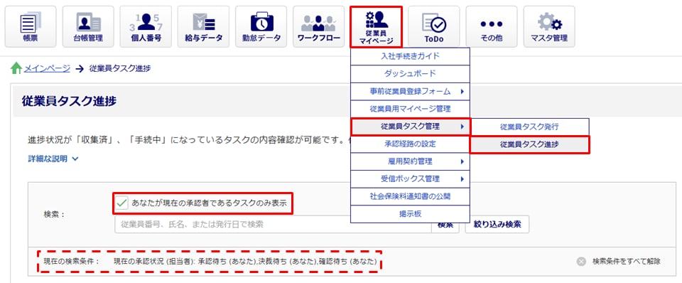 従業員タスク進捗画面に、「あなたが現在の承認者であるタスクのみ表示」チェックボックスを追加しました。