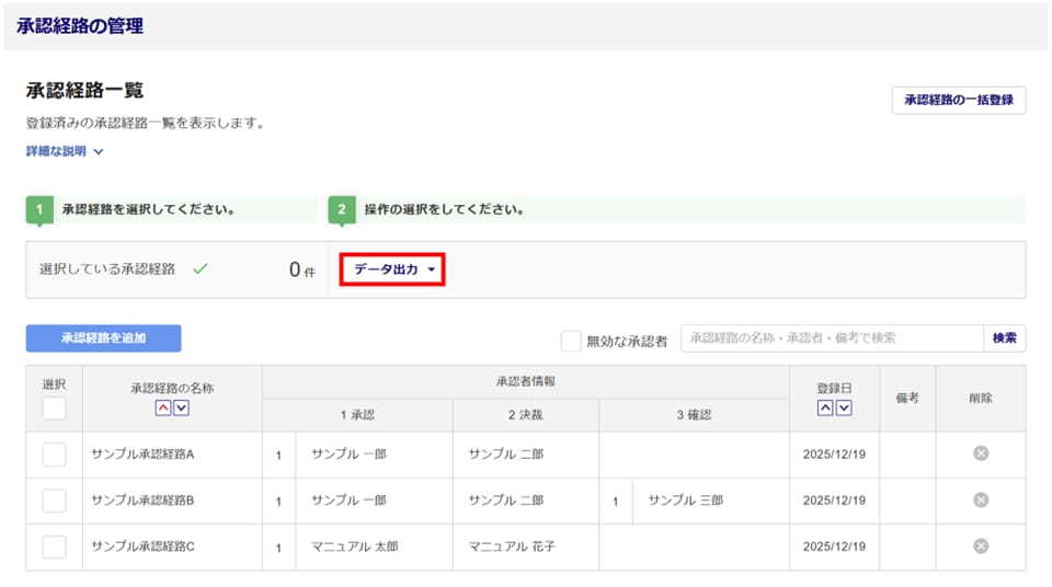 また、「承認経路の管理」画面から、選択した承認経路をExcelファイル形式で一括出力することが可能になりました。