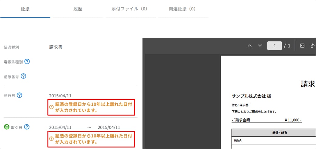 「発行日」または「取引日」に入力された日付について、証憑の登録日から10年以上の乖離がある場合にメッセージが表示されます。
